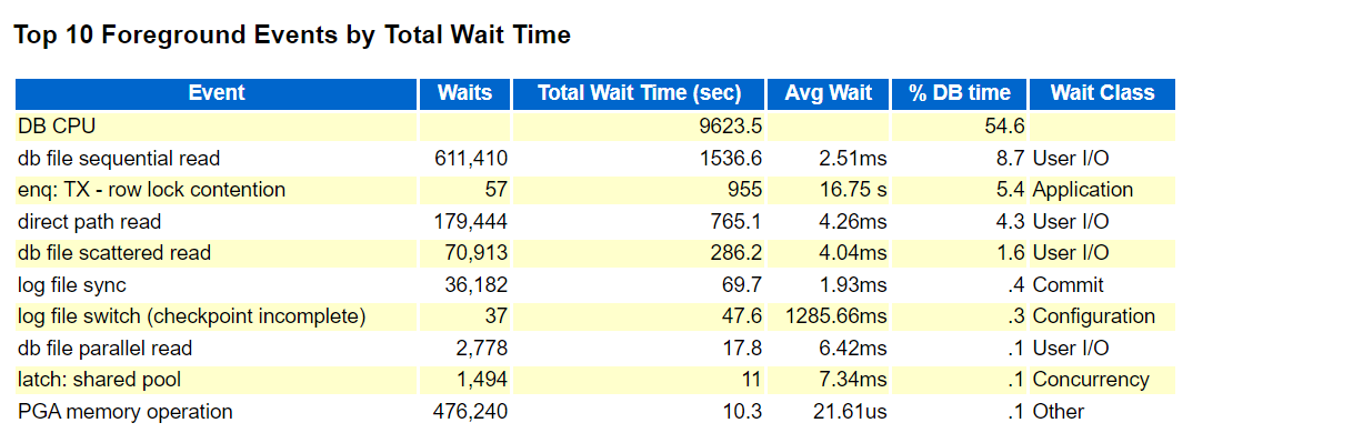 DB Time:是否明显高于报告区间的实际时长,例如报告区间只有 10 分钟,但 DB Time = 1300 分钟,说明系统有大量等待